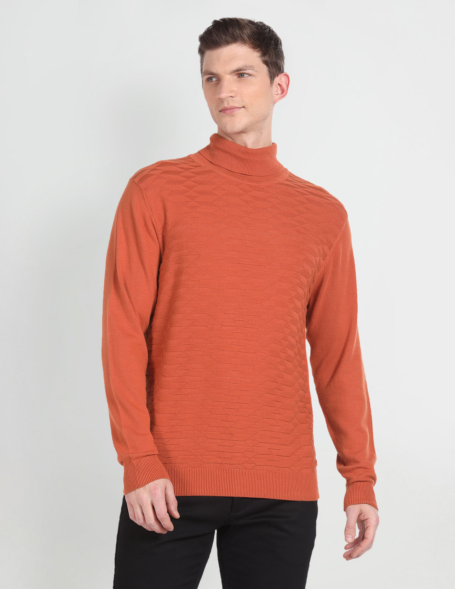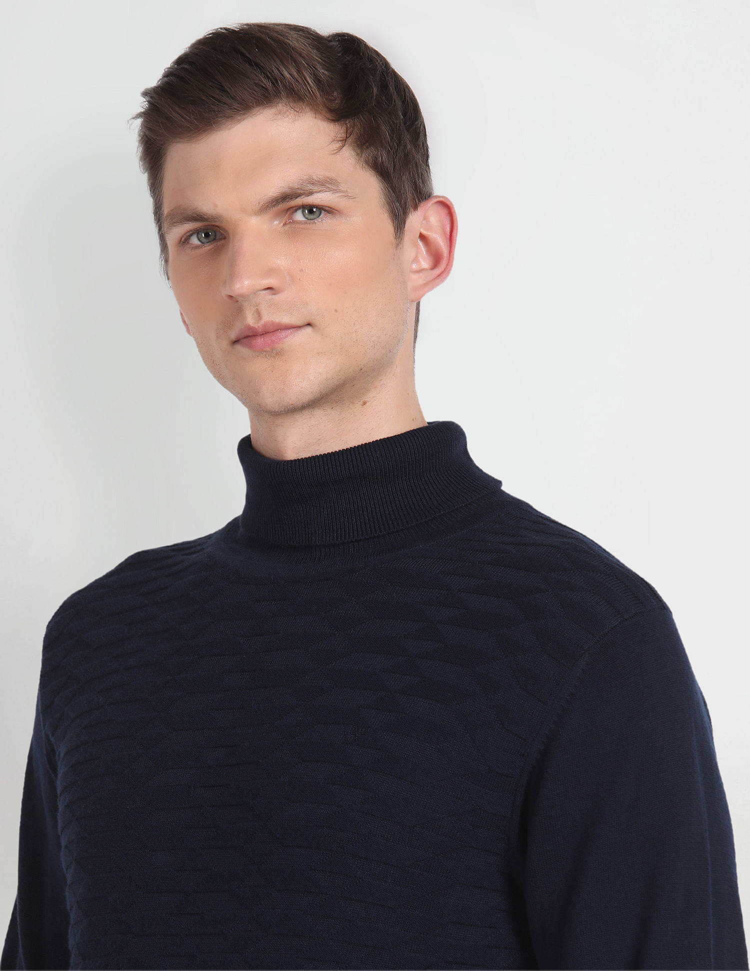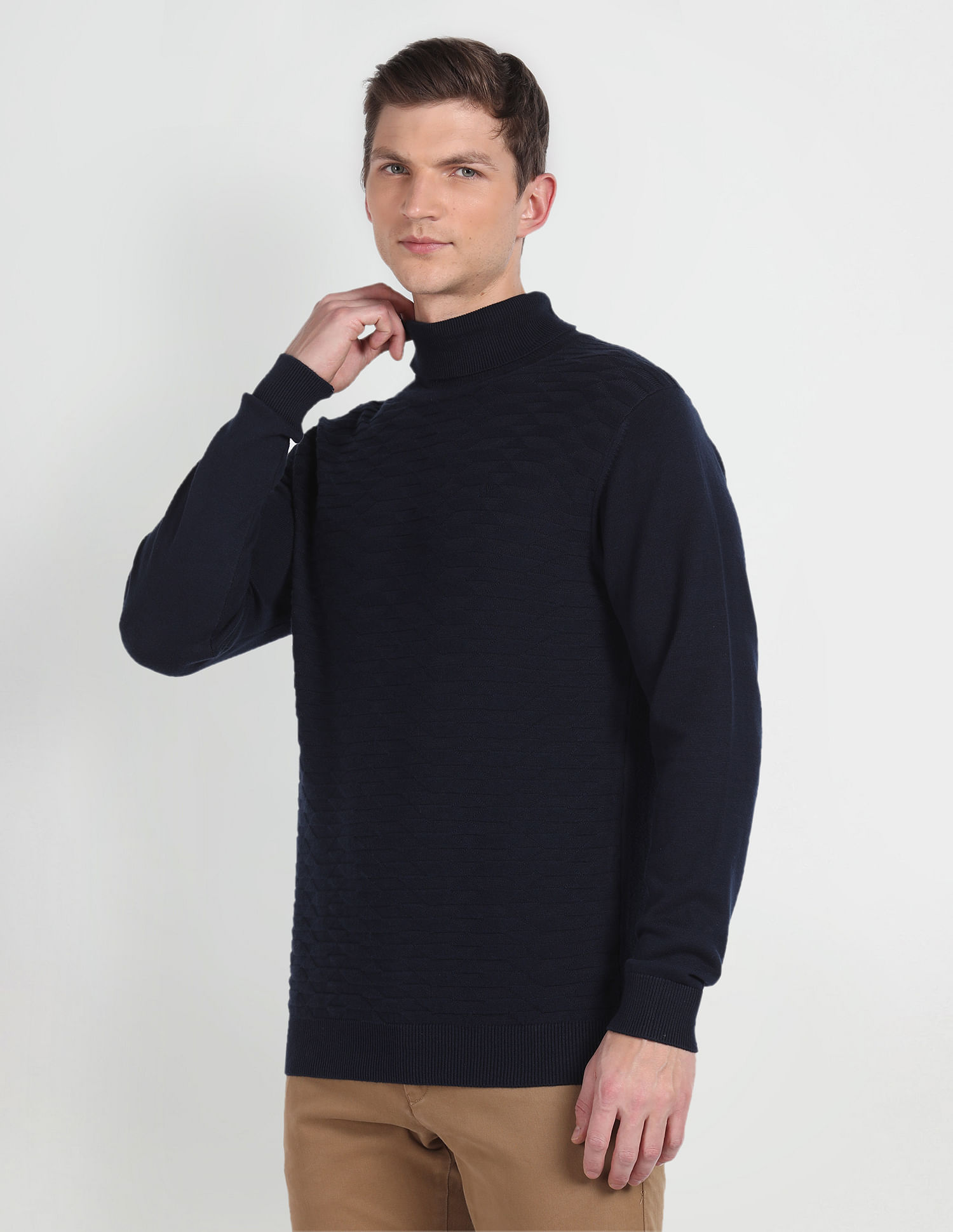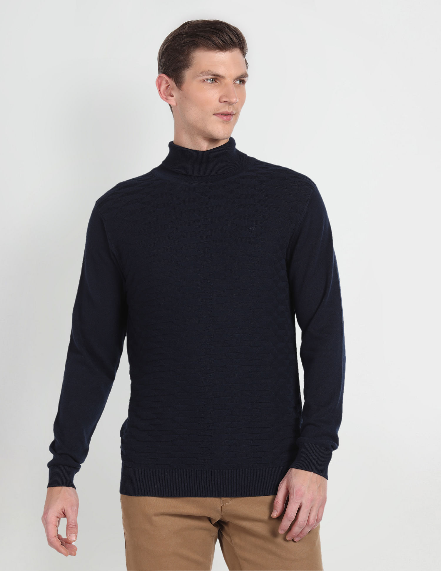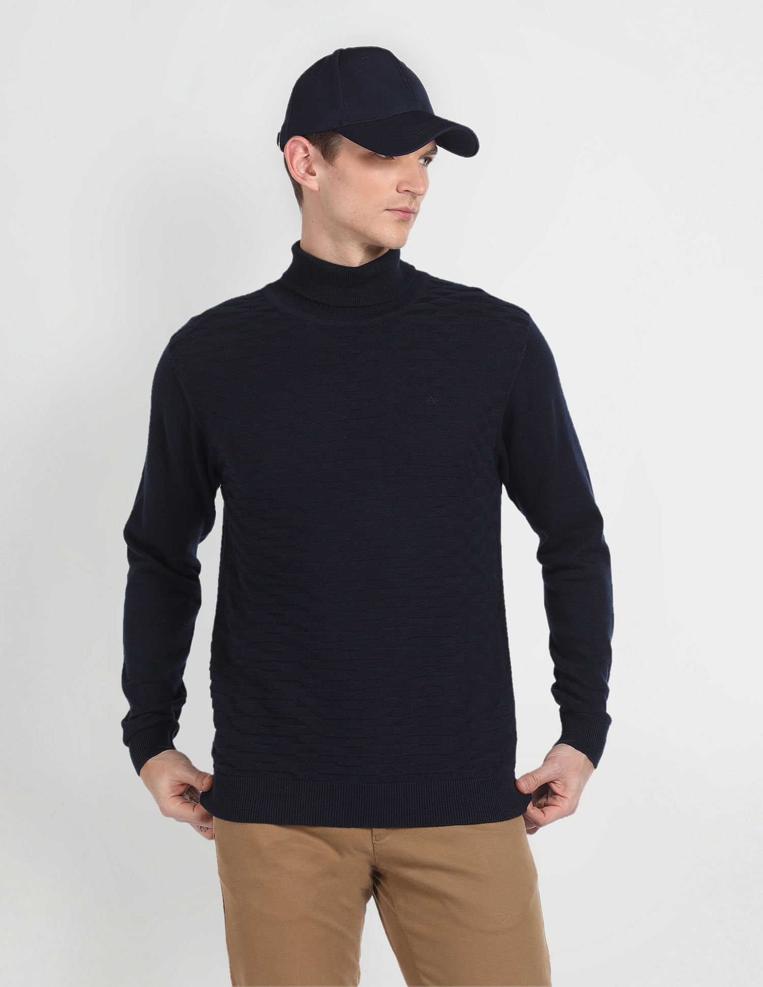 Product Description This turtle neck sweater with patterned knit is crafted with long sleeves and a ribbed straight hem. Other Details Gender: Men Manufacturer Details: Simbus Sourcing Llp, 3Rd Floor, 951, 24Th Main Jp Nagar 2Nd Phase J P Nagar Bangalore South Bangalore , Karnataka , India - 560078 Article Type: Sweaters Returnable: true Tenant Sellable Qty: 10 Base Product ID: a378d31b-eab7-3998-9347-011370f79e70 Composition: Cotton blend Care: Machine wash Specification: Turtle neck
